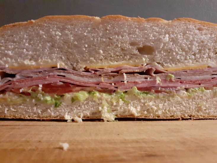 It is a Huge sandwich that can easily be cut in half length-wise, then cut in half across to get 4 good-sized sandwiches. That is $2.75 per sandwich. Feeding a family of four. Which is a really good deal. It is heavy on the bread, but the flavors of this sandwich still comes through. This is a very good Sandwich and for the portion size and price, it can’t be beat.